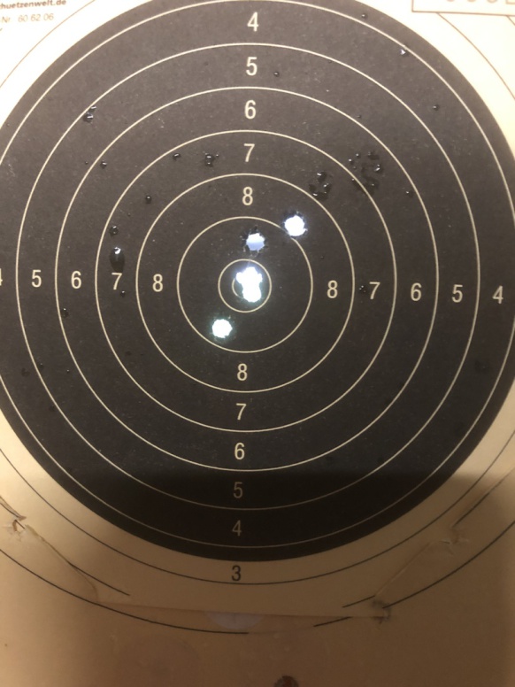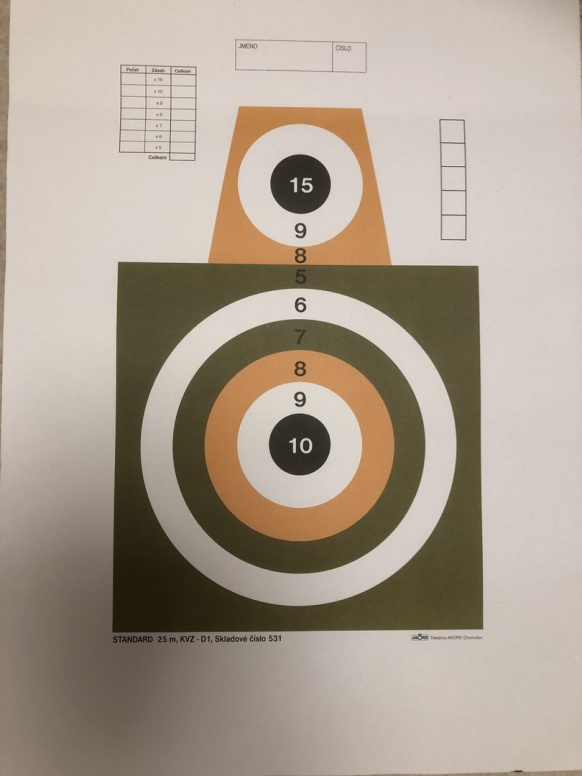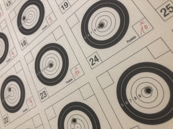 Was ist die Aufgabe? 4 x 5 Schuss auf der Scheibe so zu platzieren, dass eine möglichst hohe Ringzahl herauskommt. Natürlich gibt es ein, zwei Einschränkungen, die dieses Vorhaben erschweren. Als da wären: Keine Probeschüsse auf die Wettkampfscheibe. Und beide Scheibenteile (oberer Pyramidenstumpf und unteres Quadrat) müssen jeweils mindestens 5 Treffer aufweisen.